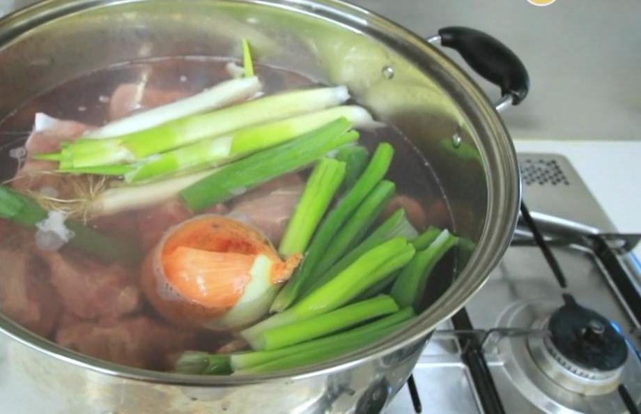 ③ 육수용 큰 냄비에 등뼈가 잠기도록 물을 넣고 대파 3대, 생강 4개, 양파 1개를 넣고 끓입니다. 이때 대파는 뿌리를 잘 씻어서 뿌리 째, 양파도 통양파를 세척 후 껍질 째 넣어주면 맛도 좋고 잡내 없는 진한 육수를 만들 수 있어요.