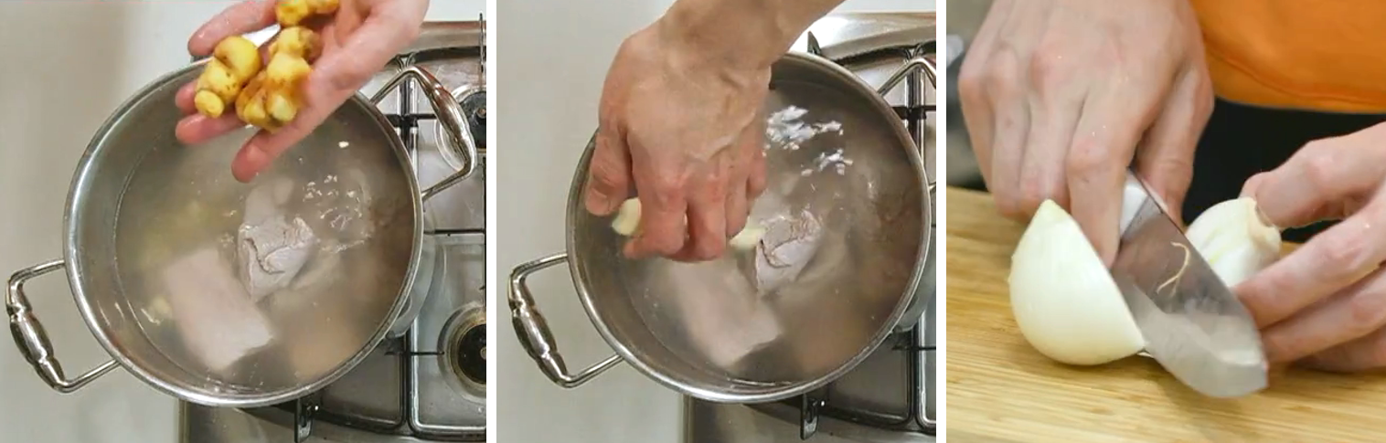 ② 생강 3개, 마늘 10개, 반으로 자른 양파 1개를 넣어주세요.