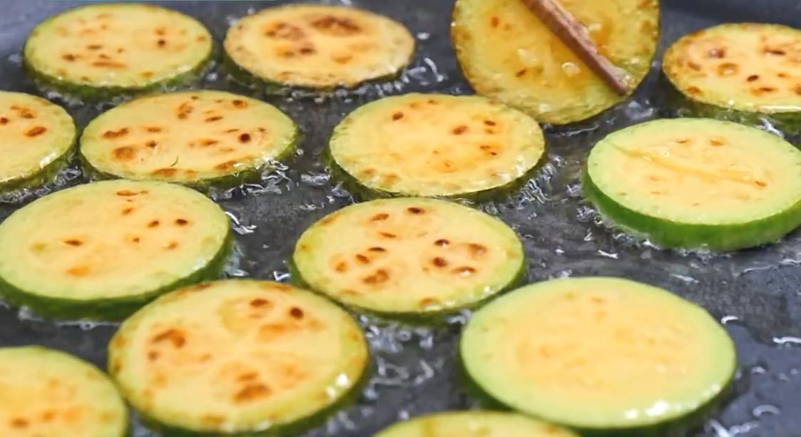 ② 프라이팬에 기름을 넉넉하게 둘러주고, 애호박 표면이 갈색으로 충분히 익을 때까지 노릇노릇 구워주세요.