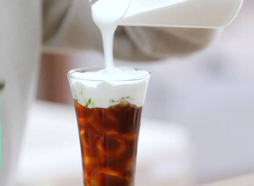 ⑤ 생크림 50ml에 바닐라 시럽 1/2t를 넣고 거품기로 휘핑해준 후 적당한 농도가 되면 커피 위로 층을 쌓아 올려주세요. 바닐라 시럽은 같은 양의 설탕으로 대체 가능하세요.