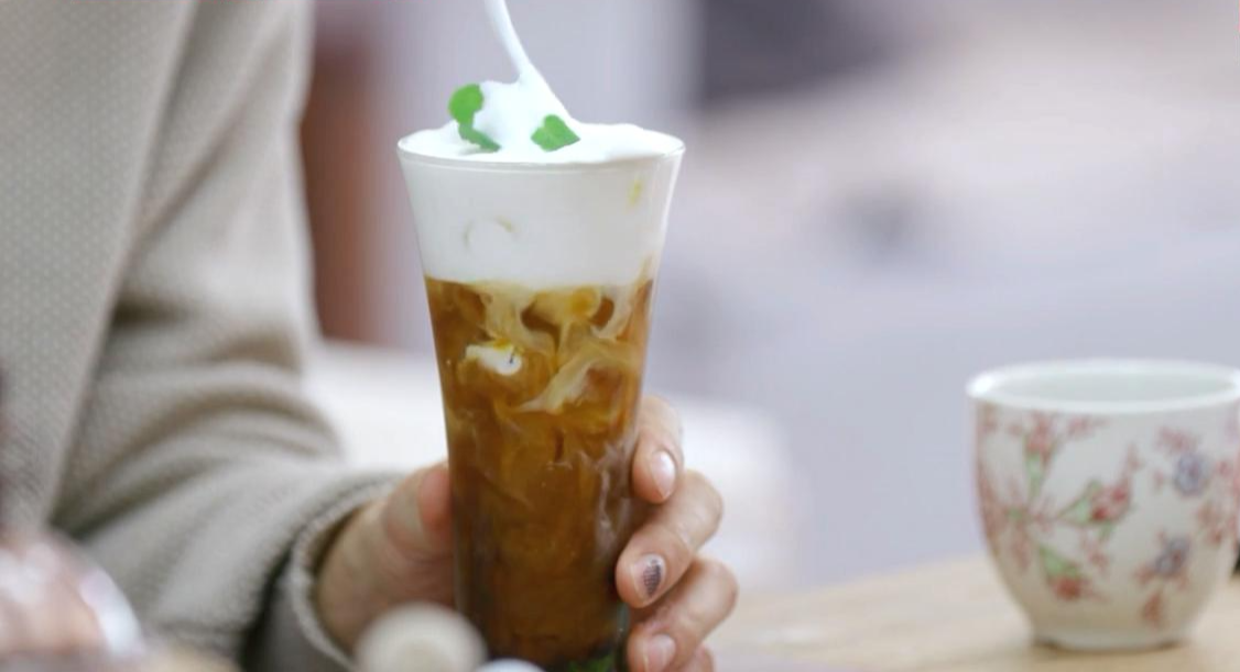 ⑥ 커피 위에 휘핑한 크림을 올리고, 애플민트 잎으로 데코 하면 완성! 드실 때는 위아래로 잘 섞어주세요. 그럼 맛있게 드세요!
